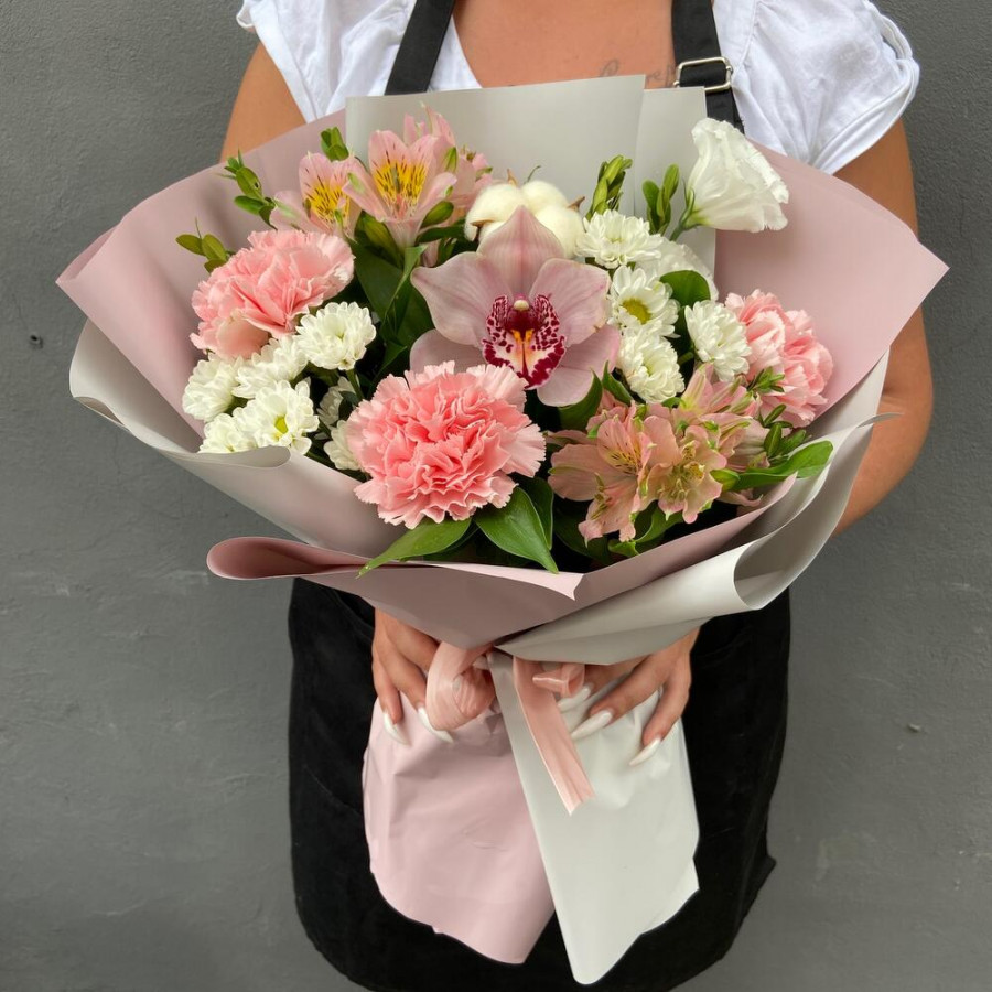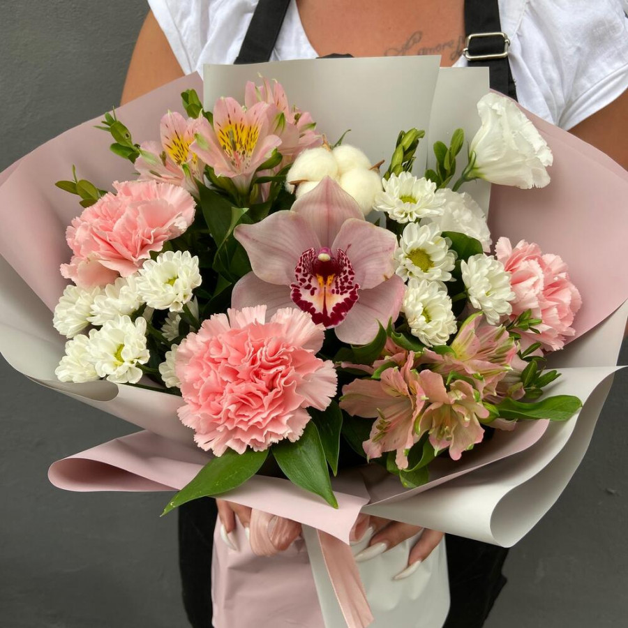На фото букет «светлый шепот». В составе: альстромерия 2 шт, хризантема кустовая 2 шт, орхидея 1 шт, эустома (лизиантус) 1 шт, хлопок 1 шт, дизайнерская упаковка 1 шт, атласная лента 1 шт, . Все цветы свежие и ароматные, букет красиво оформлен и отлично подходит для подарка. Доступна доставка цветов или самовывоз.
